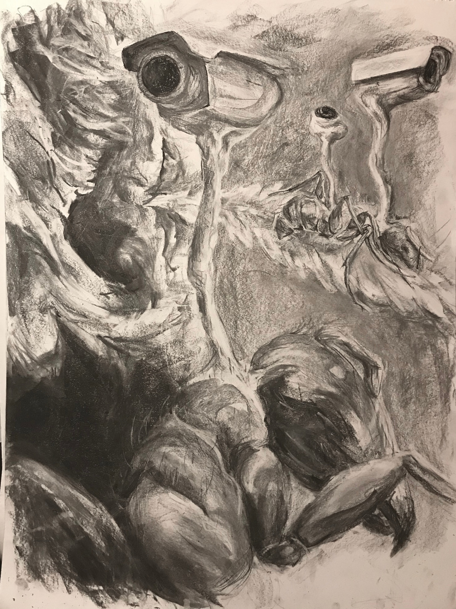 Hand-drawn charcoal illustration for science fiction story